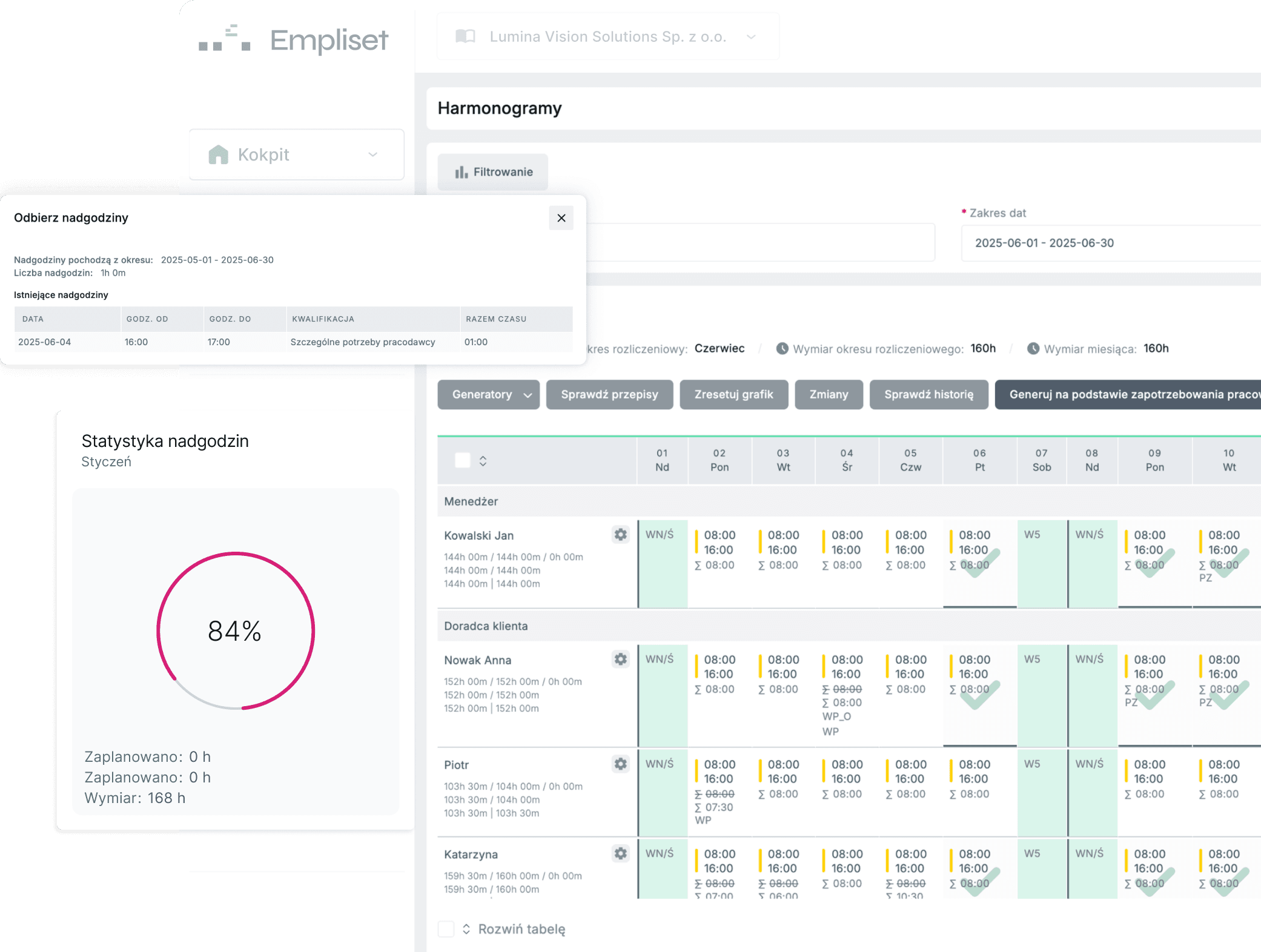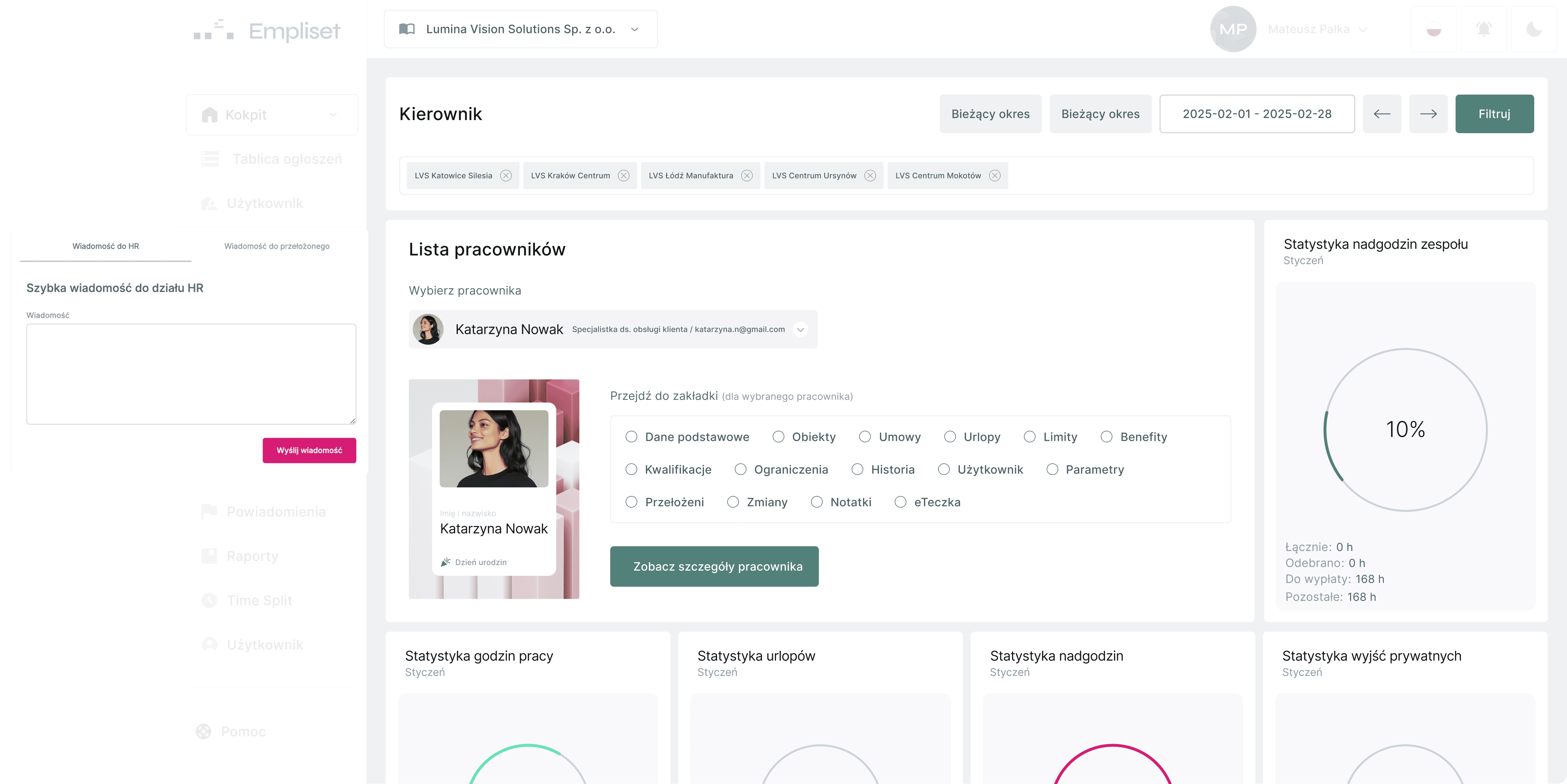 Dashboard z KPI. Zarządzanie wnioskami. Monitorowanie potrzeb i rekrutacji. Automatyczne rozliczanie nadgodzin