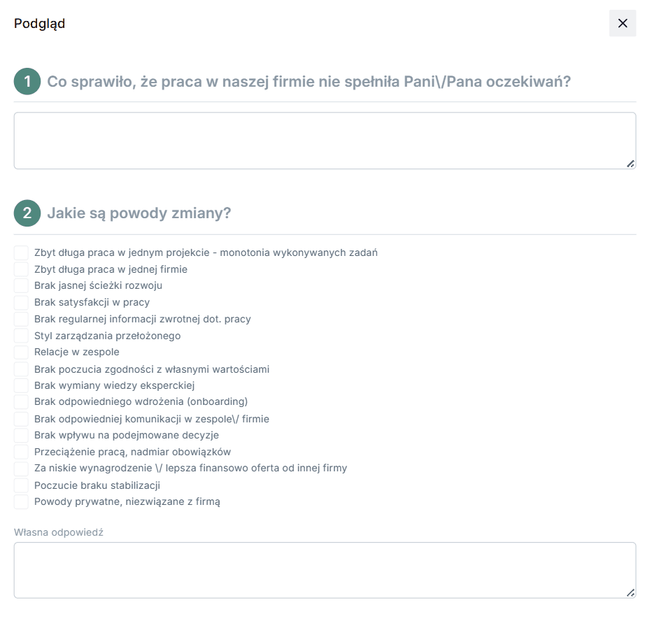 Tak. Jeśli klient posiada moduł HRM, ma dostęp do gotowych ankiet, w tym ankiety exit interview.