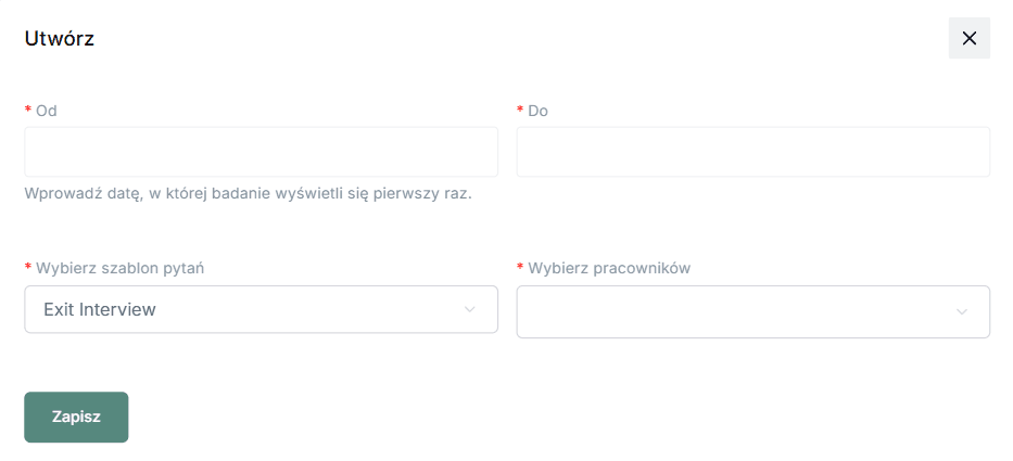 Proces jest w pełni zarządzalny z poziomu systemu – dział HR określa zakres dat obowiązywania badania oraz wskazuje grupę pracowników objętych ankietą. Po uruchomieniu badania formularz automatycznie pojawia się na profilu pracownika. Po jego wypełnieniu wyniki trafiają bezpośrednio do działu HR, umożliwiając dalszą analizę i wyciąganie wniosków.