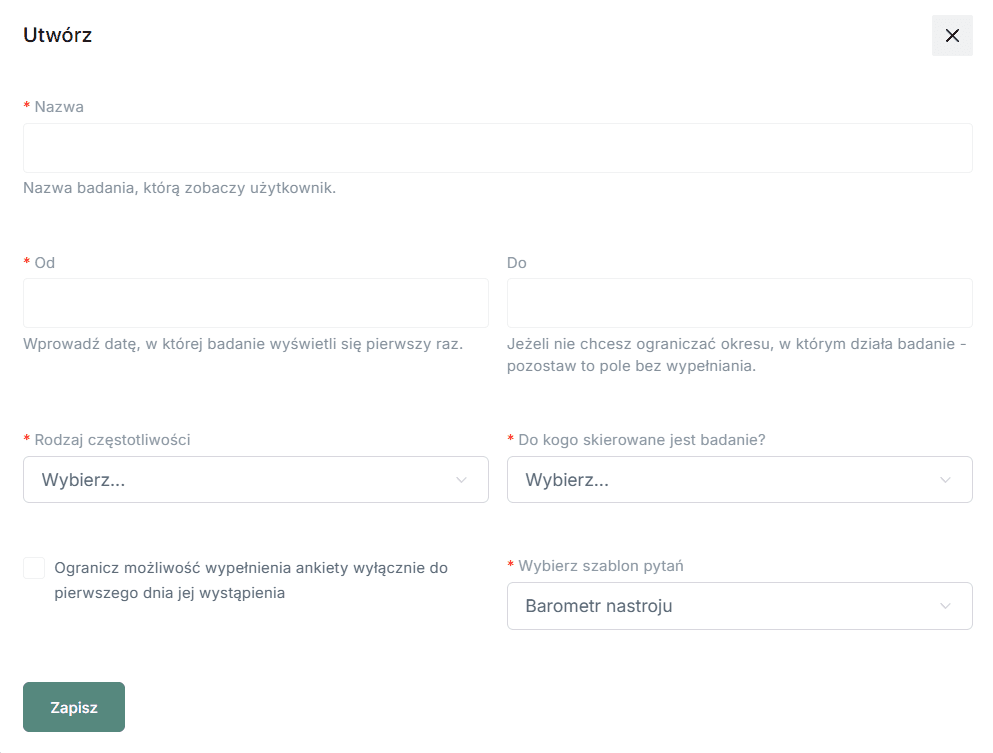 Tak, w systemie dostępny jest gotowy wzór, z którego można skorzystać. Istnieje jednak również możliwość stworzenia własnej ankiety, dostosowanej do potrzeb organizacji.