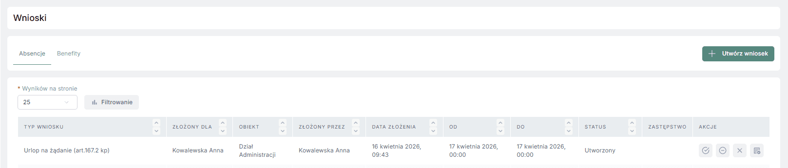 W aplikacji, w sekcji „Wnioski”, jest możliwość zgłoszenia urlopu na żądanie, który zostanie automatycznie przesłany do przełożonego.